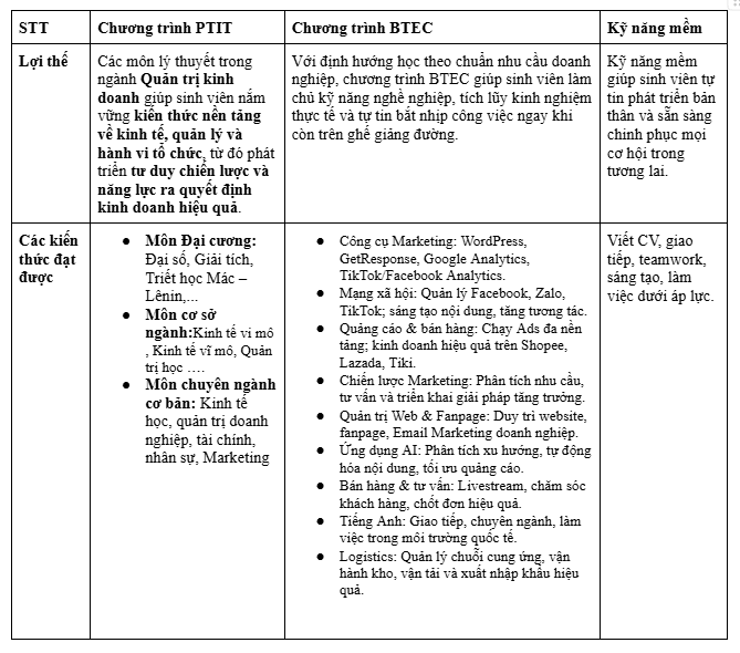 Trong bối cảnh kinh tế hội nhập, ngành Quản trị kinh doanh đóng vai trò quan trọng trong việc vận hành, phát triển và định hướng chiến lược cho doanh nghiệp. Với sự kết hợp của kiến thức quản trị và tư duy marketing hiện đại, sinh viên không chỉ học cách quản lý hiệu quả mà còn biết cách xây dựng thương hiệu, nắm bắt tâm lý khách hàng và phát triển thị trường. Chương trình đào tạo giúp người học rèn luyện kỹ năng lãnh đạo, tư duy phân tích và khả năng ra quyết định trong môi trường cạnh tranh. Sau khi tốt nghiệp, sinh viên có thể đảm nhiệm nhiều vị trí như chuyên viên marketing, quản lý kinh doanh, hoạch định chiến lược hoặc khởi nghiệp. Hãy cùng khám phá xem ngành Quản trị kinh doanh tại BTEC - PTIT sẽ mang đến cho bạn những trải nghiệm học tập và cơ hội nghề nghiệp thú vị nào nhé!
